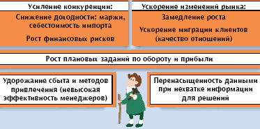 Неудивительно, что компаниям приходится тратить все больше и больше средств на привлечение клиентов: брать новых дорогостоящих сотрудников-продавцов, увеличивать размер комиссионных выплат, объем расходов на рекламу и прочие маркетинговые акции и т. д. Кроме того, на фоне всеобщей компьютеризации и «интернетизации» возникает синдром переизбытка информации, когда менеджерам становится все труднее в заданное время собрать точные данные для отчета или анализа ситуации, и быстро принять единственно верное решение. В результате выполнение плана по обороту и прибыли становится еще более сложной задачей на фоне роста издержек при сохранении ожиданий акционеров на уровне прежних лет. Как выйти из этого порочного круга, учитывая, что сегодня размер клиентской базы уже ограничен, а наращивание ассортимента продуктов и услуг имеет «естественный» предел, поскольку является легко копируемым конкурентным преимуществом, если не иметь эксклюзивных условий?