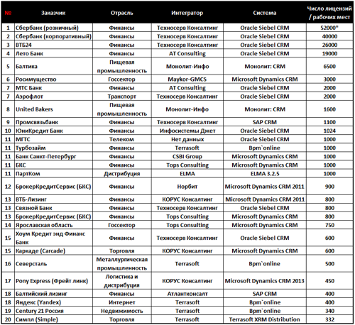 Два самых крупных проекта по внедрению CRM-решений (Customer Relationship Management — систем управления взаимоотношениями с клиентами) реализованы в Сбербанке — это СRM для работы с розничными клиентами и CRM для работы с корпоративными клиентами. В первой системе по состоянию на октябрь 2015 г. работало порядка 52 тыс. пользователей (в будущем их число планируется довести до 140 тыс.), во второй — 40 тыс., говорится в отчете TAdviser. Третью строчку по величине занял проект в банке ВТБ24 (26 тыс. пользователей). Четвертое место — проект в «Лето Банке» (19 тыс. сотрудников). Все четыре проекта реализованы на базе системы Oracle Siebel. Первые три крупнейших внедрения были выполнены компанией «Техносерв Консалтинг». Реализацией проекта в «Лето Банке» занималась AT Consulting. Отчет TAdviser составлен на основе базы данных проектов, ведущейся с 2005 г. Информация в отчете представлена по состоянию на ноябрь 2015 г. По состоянию на сентябрь 2015 г. в базе насчитывалось 1,9 тыс. записей о внедрениях в России.