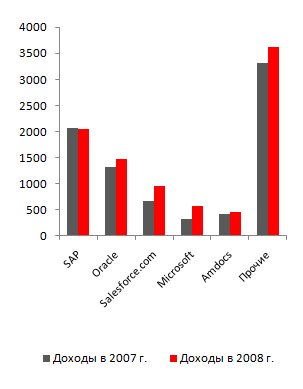 Доходы основных игроков рынка CRM в 2007-2008 годах