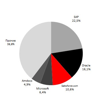 Компания SAP (досье) продолжает оставаться лидером на рынке CRM-систем, на ее долю в 2008 году приходится 22,5% поступлений мирового CRM-рынка (25,5% в 2007 году).