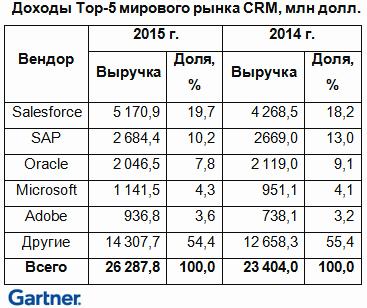 Если верить подсчетам Gartner, по итогам прошлого года объем мирового рынка CRM достиг 26,3 млрд долл. Результат 2014 г., выручка в котором составила 23,4 млрд долл., был улучшен на 12,3%.